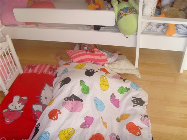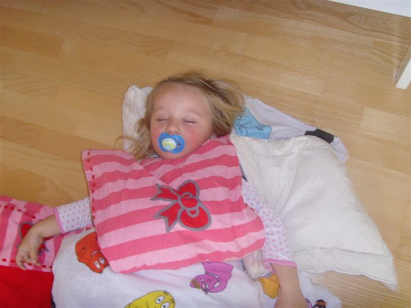 Phillipa sover ikke til middag nede i børnehaven længere. Men når vi kommer hjem så er hun simpelthen så træt, så hun sover en lille lur. Nu er hun så begyndt at sove på gulvet inde på hendes værelse