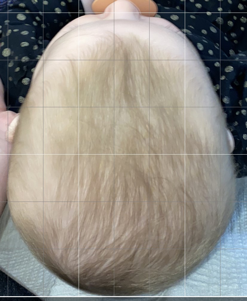 Han er stadig skæv i kraniet nu som 2-årig. Heldigvis dækker hans halvlange hår for det værste, men han er ret usymmetrisk i ansigtet og f.eks. elefanthuer og hans briller sidder lidt skævt på ham.