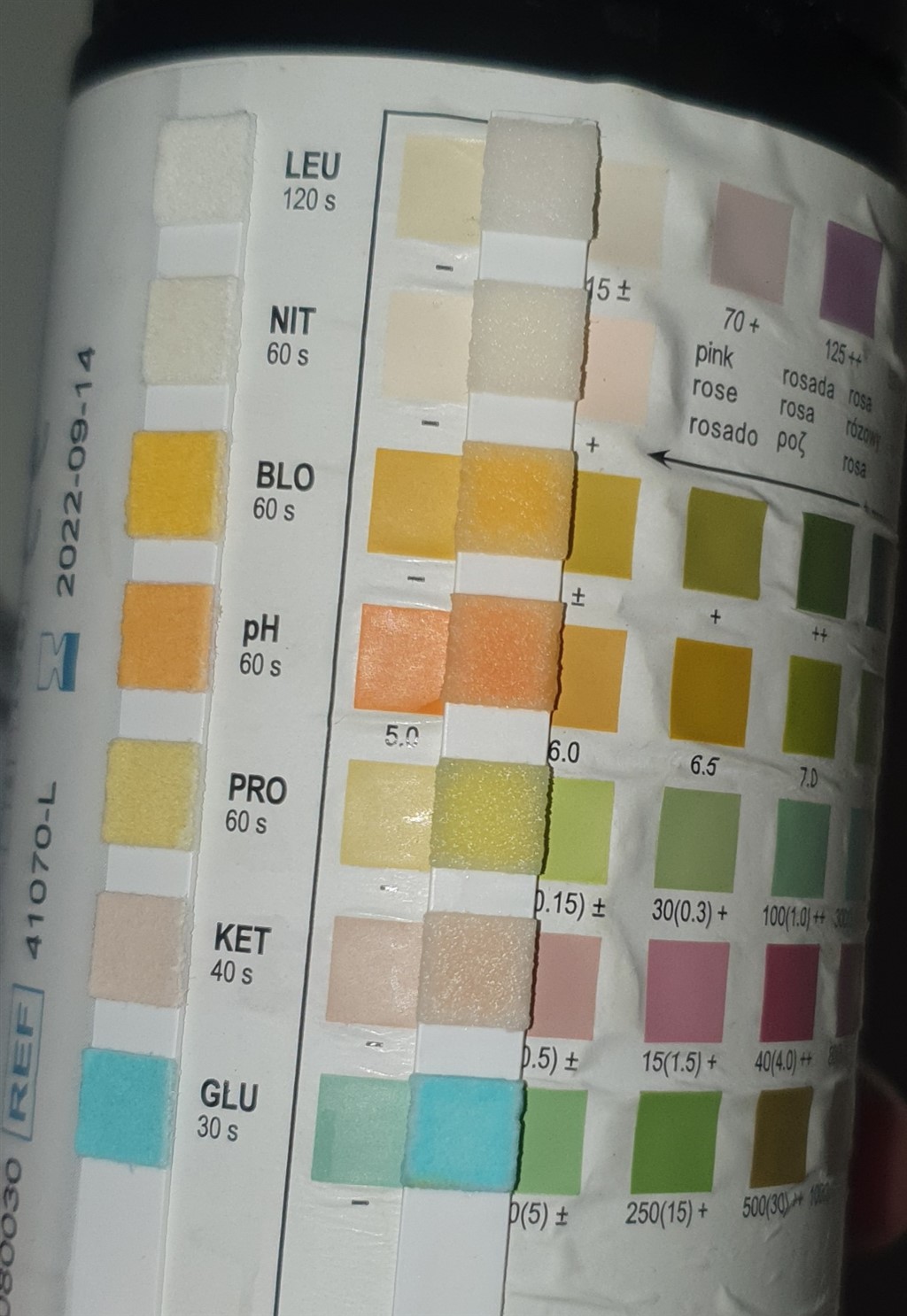 MEN. Til gengæld er mit blodtryk normalt - en anelse højere end det har været (min mand er sundhedsfaglig, vi tjekker det jævnligt), men under den "farlige" grænse. Det er ca 130/85. Vanlig niveau seneste tid har været ca 123/75. Jeg har heller ikke taget på ifa. Ødemer, snarere har jeg vejet det samme i 7 uger (men er svært overvægtig, så det er ok). Ift spor af protein i urinen ser det ud som på billedet nedenunder. Som jeg ser det, er den Max +/-, dog lidt mørkere i kanten.