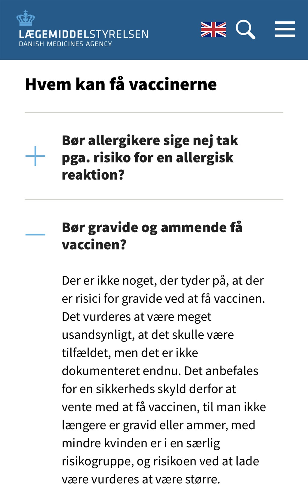 Center for Disease Control er i gang med et større studie med 124.500 gravide, der har modtaget pfizer eller moderna. Pt er 25% af data publiceret og der fandtes ingen forskel sammenlignet med ikke gravide. 800 af graviditeterne var afsluttet på tidspunktet og der fandtes ingen overhyppighed af abort, dødfødsel, for tidlig fødsel, væksthæmning, misdannelser eller neonatal død hos børnene - igen imodsætning til de der var ramt af Covid-19.