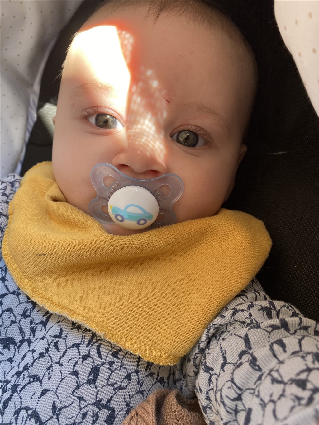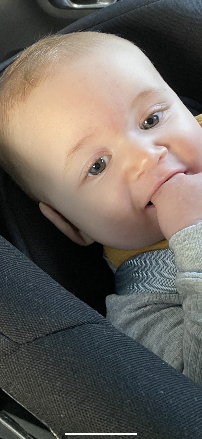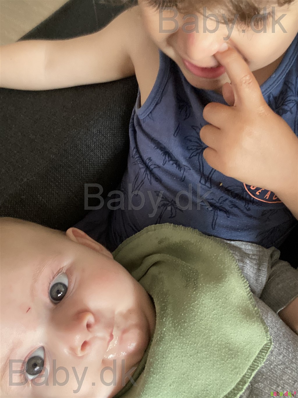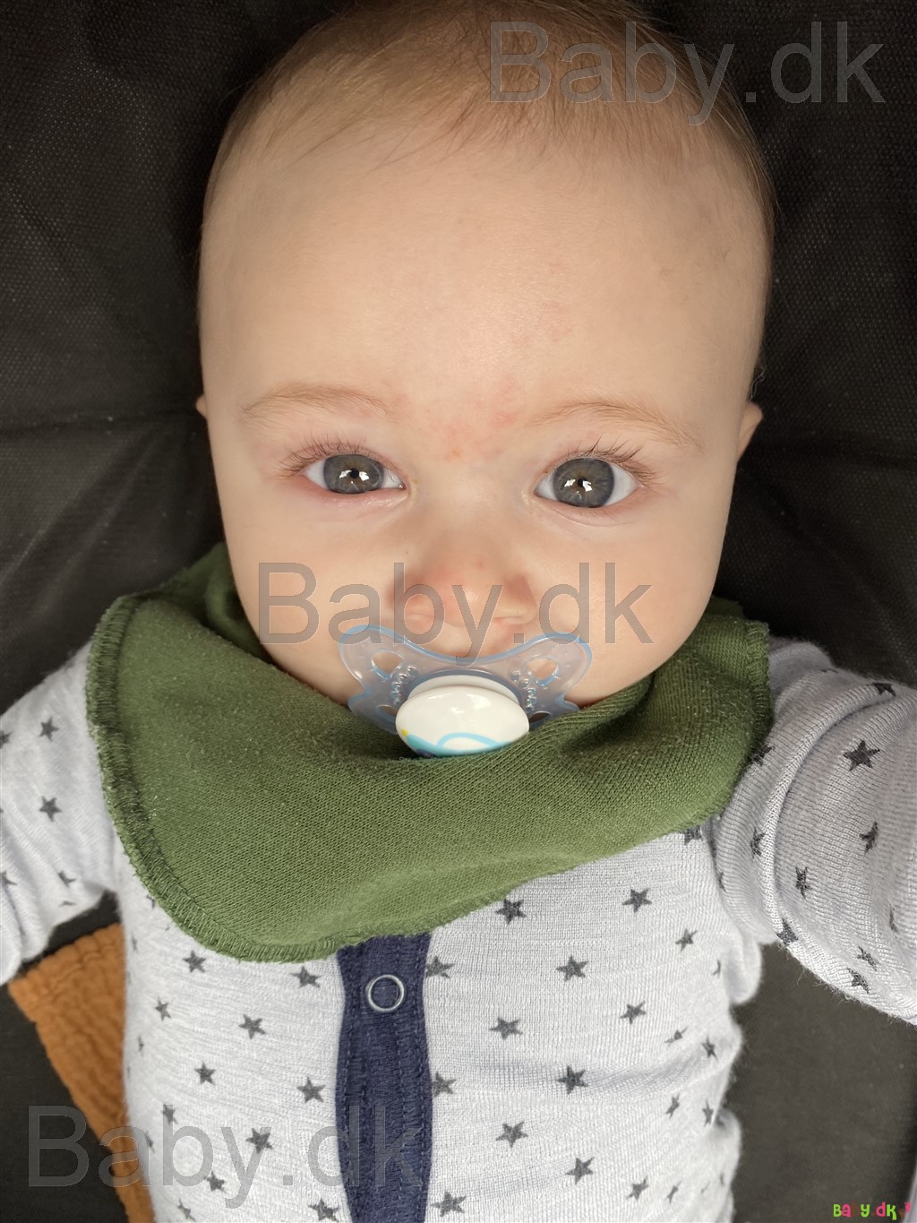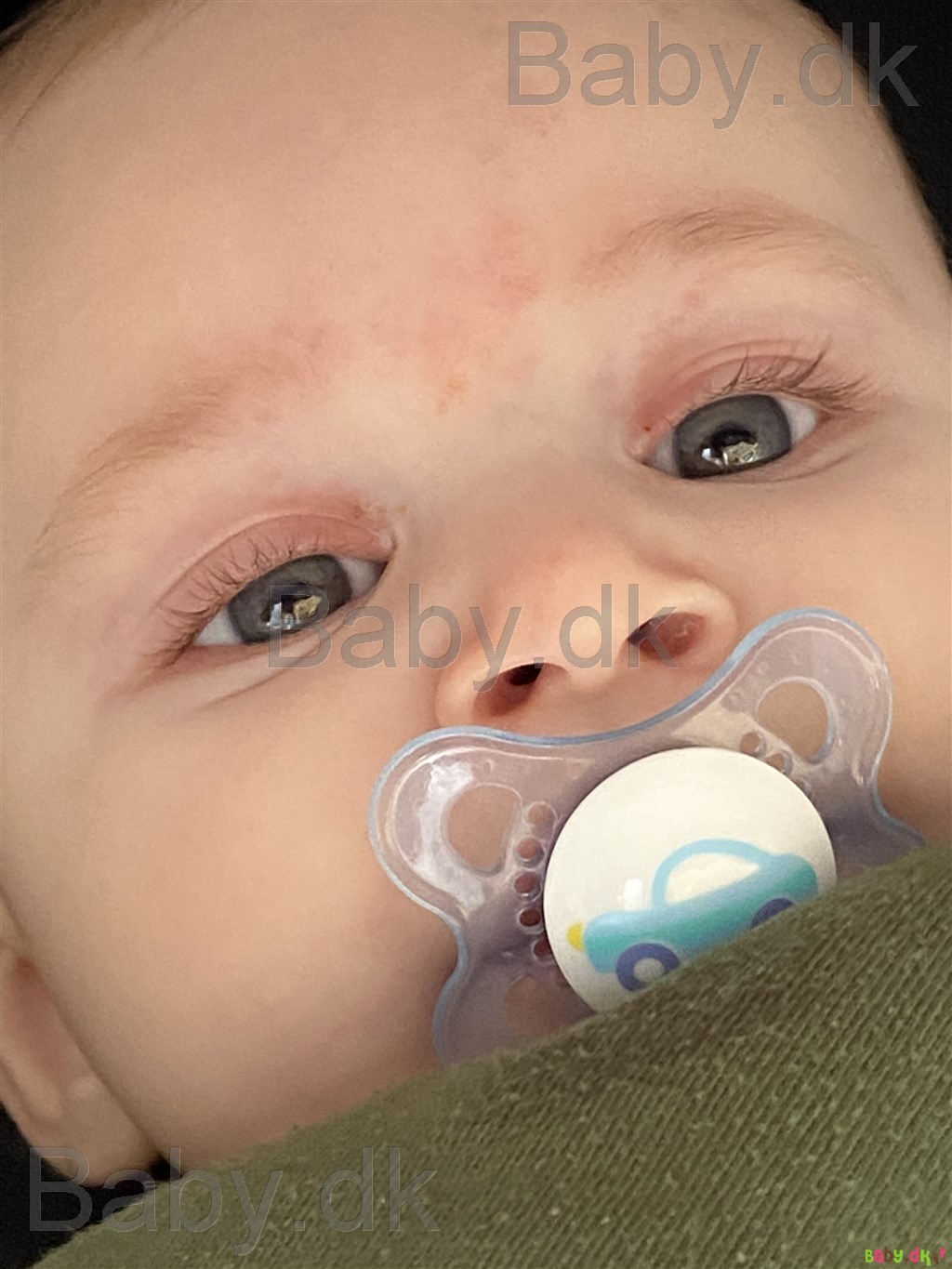 Det er svært at sige på nuværende tidspunkt. Her har manden meget mørkebrune øjne, og jeg har grå/blå. Vores ældste dreng havde helt grå øjne, og de forblev faktisk i den tone ind til han var 3-4 år. Nu hvor han er 5, er de skiftet til lysebrune. Lillebror blev også født med helt grå øjne, men allerede i løbet af et halvt års tid blev de helt mørkebrune ligesom fars.