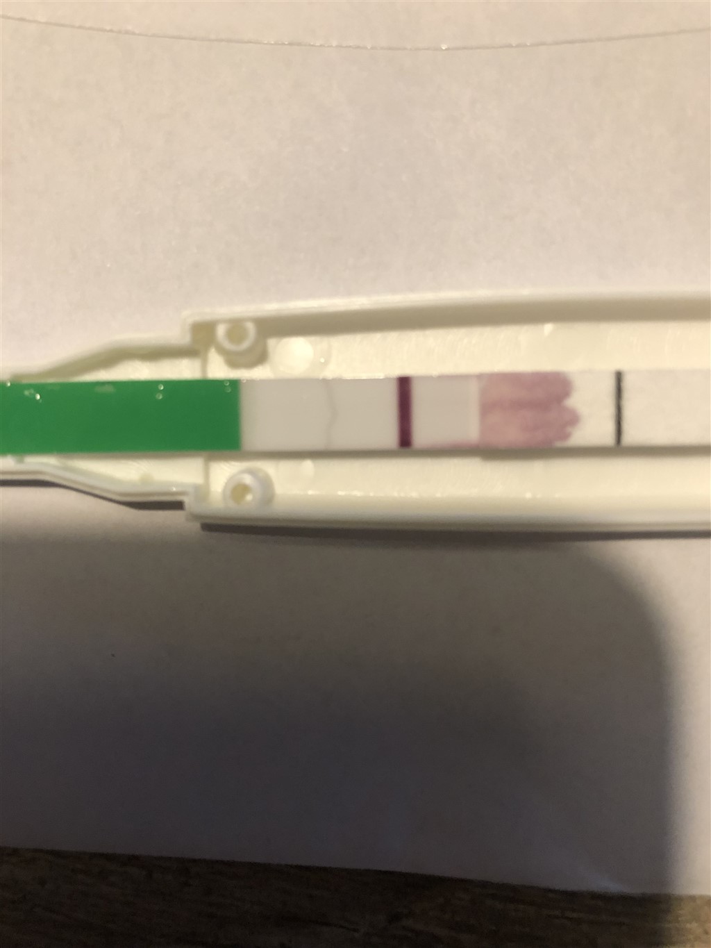 Jeg har taget denne test her til morgen, men har da aldrig set sådan en streg før. Den kom efter 2 min. Tager en ny senere. Men nogen der har oplevet noget lignende? Den er der hvor streg nr 2 skal være kan man se men hvorfor er den buet.