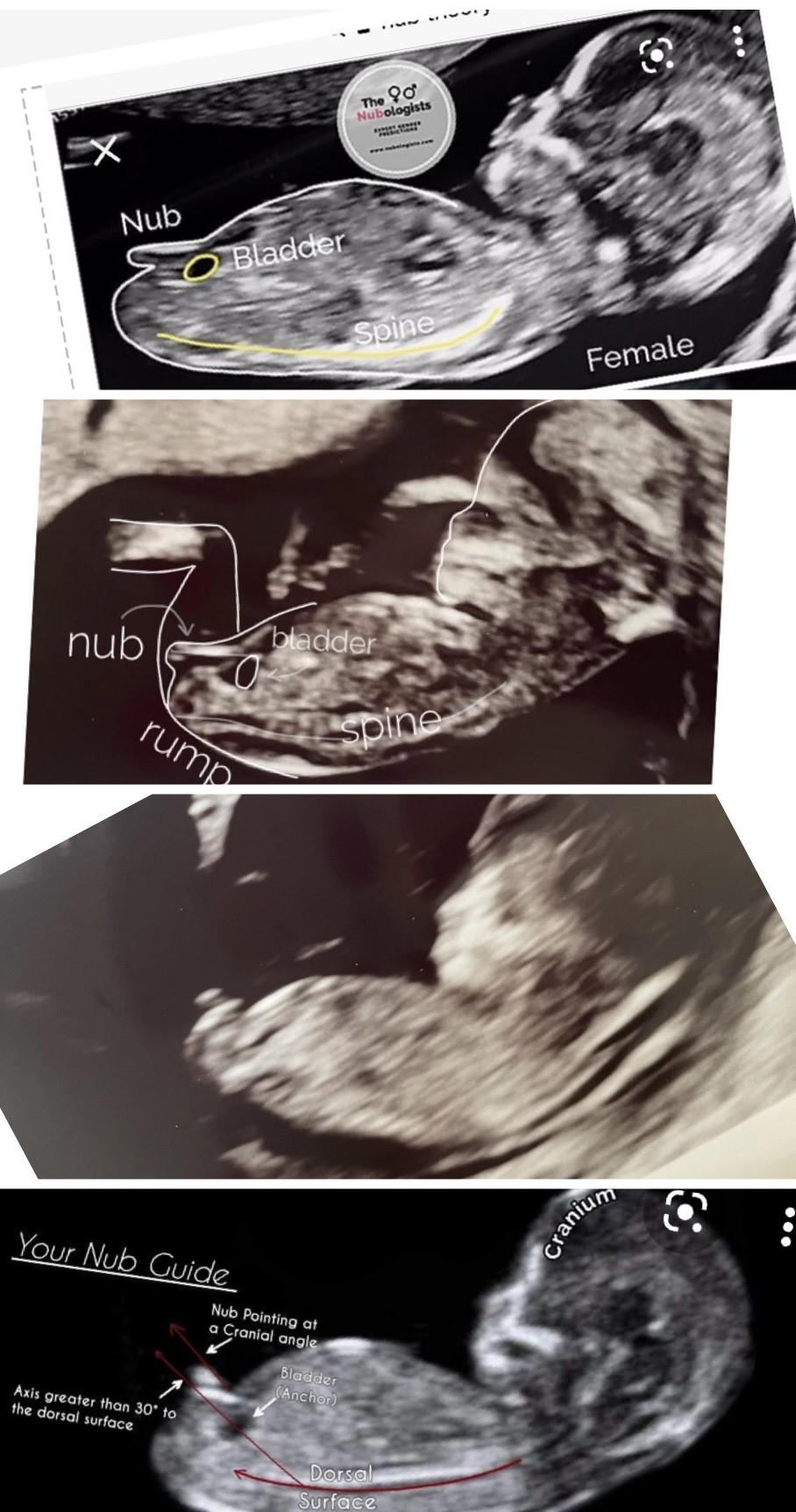 De to midterste billeder er mine og det øverste og nederste er eksempler på nub-teorien. På det billede af mine, hvor eksperterne vurderer (og har tegnet), at det er en pige, kan jeg jo se en hvid prik ovenfor, som må være drengenubben? For ikke at tale om det andet, ret tydelige billede, som jeg også sendte til eksperterne.
