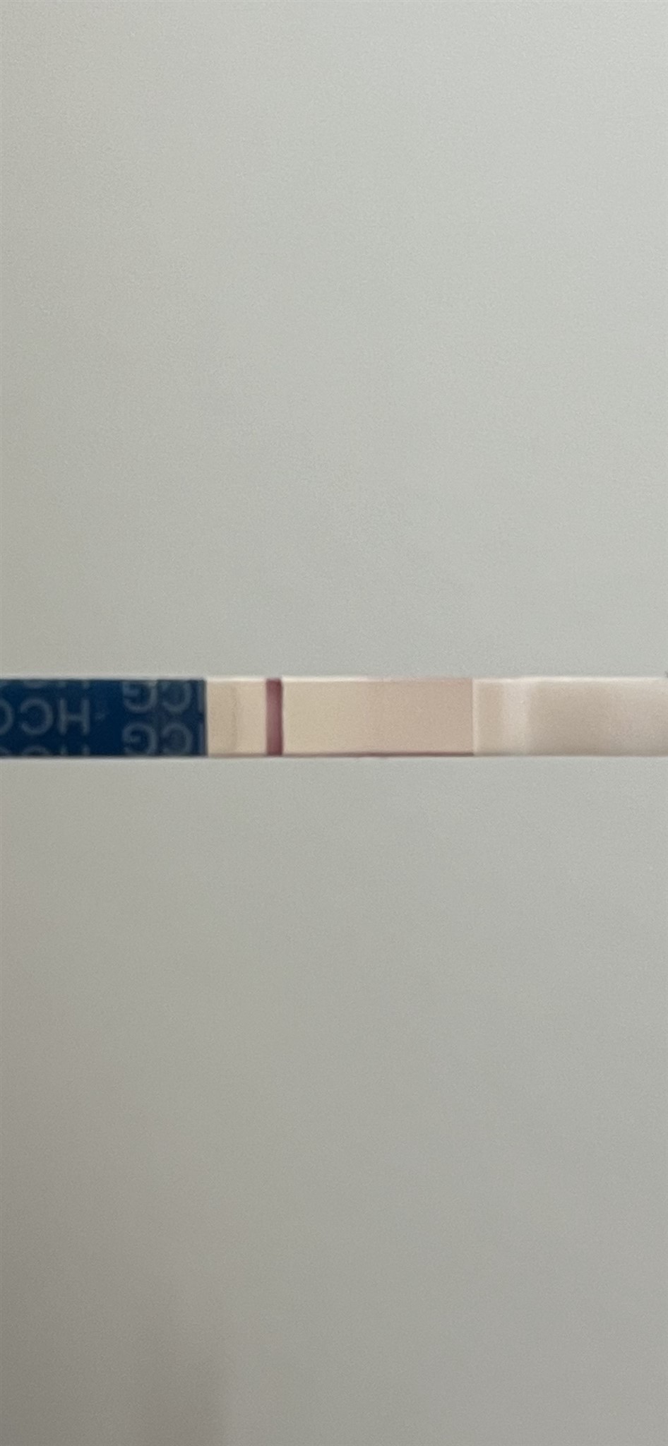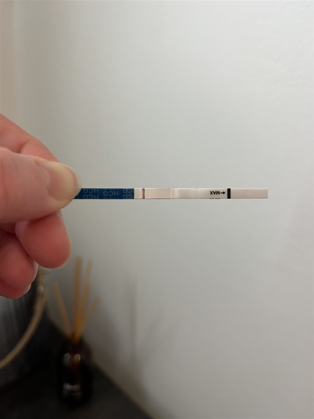 Jeg tør ikke tro på det. Især ikke efter min test her til morgen var negativ. Den fra igår er jeg slet ikke tvivl om har en streg, meget svag, men den her til morgen er jeg i tvivl om. Man kan se hvor stegen skal være… men det kræver et slapt øje.