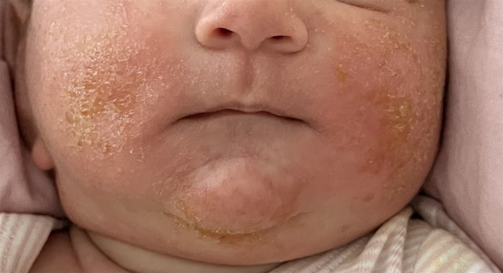 Min datter på 6 uger havde til at starte med meget rød og tør hud på kinder, som sundhedsplejersken vurderede var hormonknopper. Nu er der gule skorper på kinden, jf. vedhæftet billede, og jeg tænker umiddelbart, at det er eksem. Jeg kontakter selvfølgelig lægen i morgen. Men hvad tænker I?