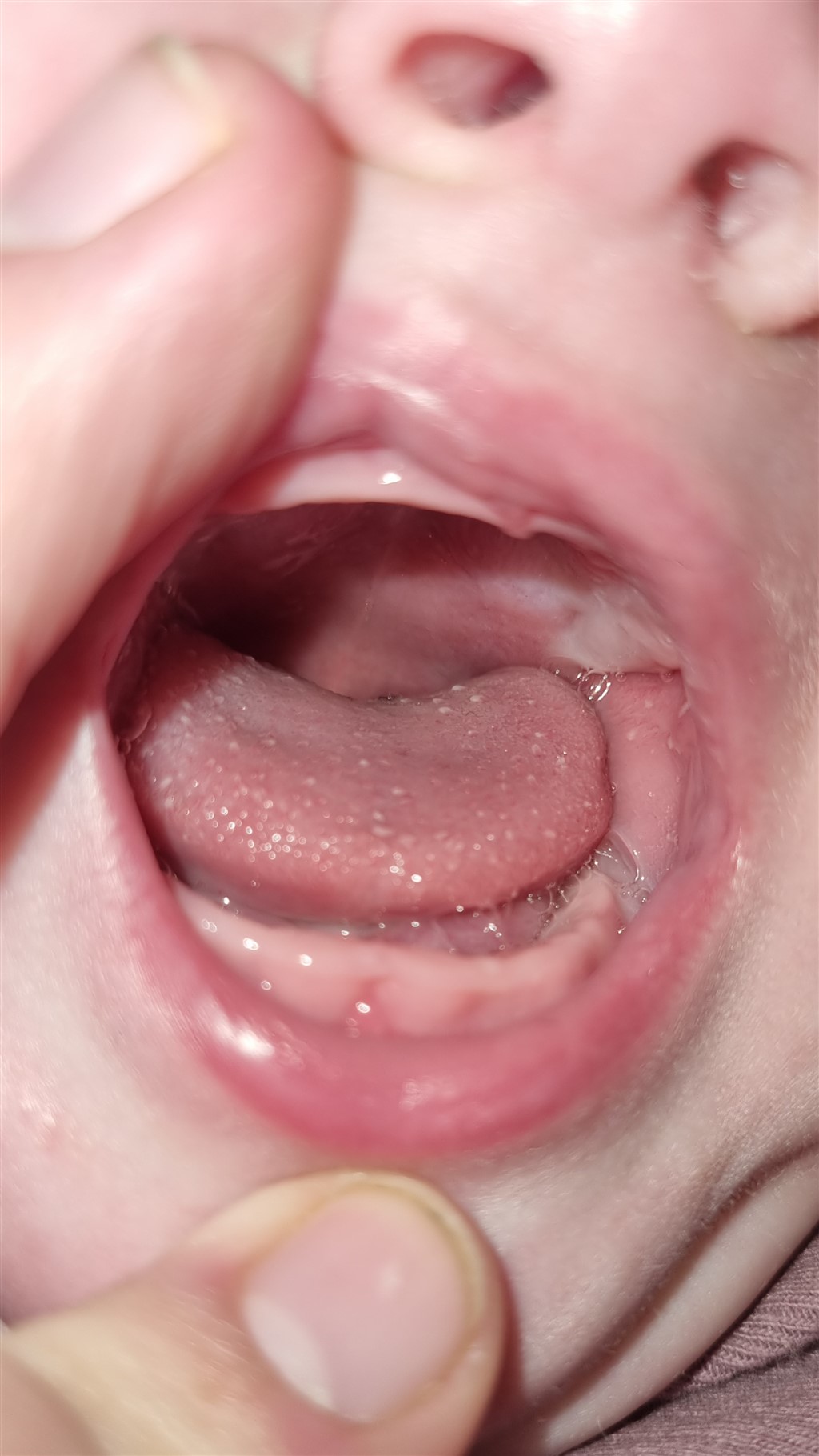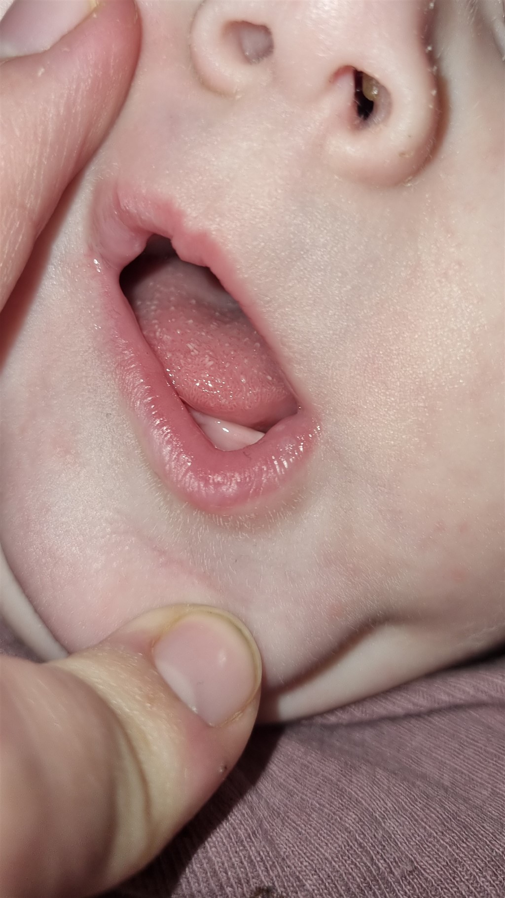 Nogen bud på hvad det kan være på min babys tunge. Hun er også hvid på læberne engang imellem, men det kommer og går på læberne.
