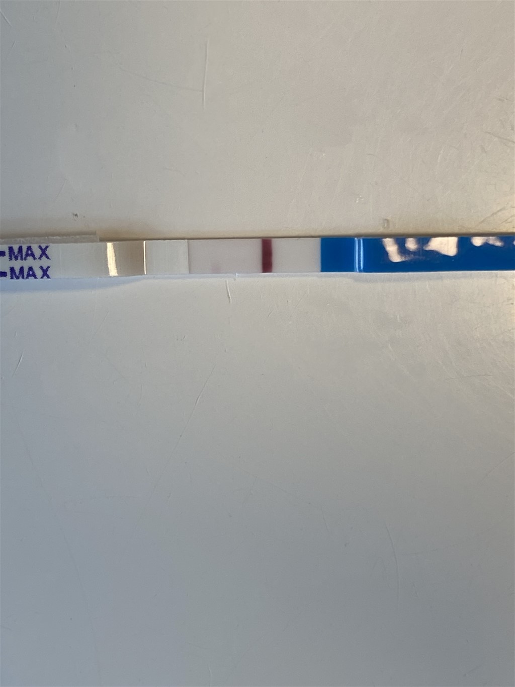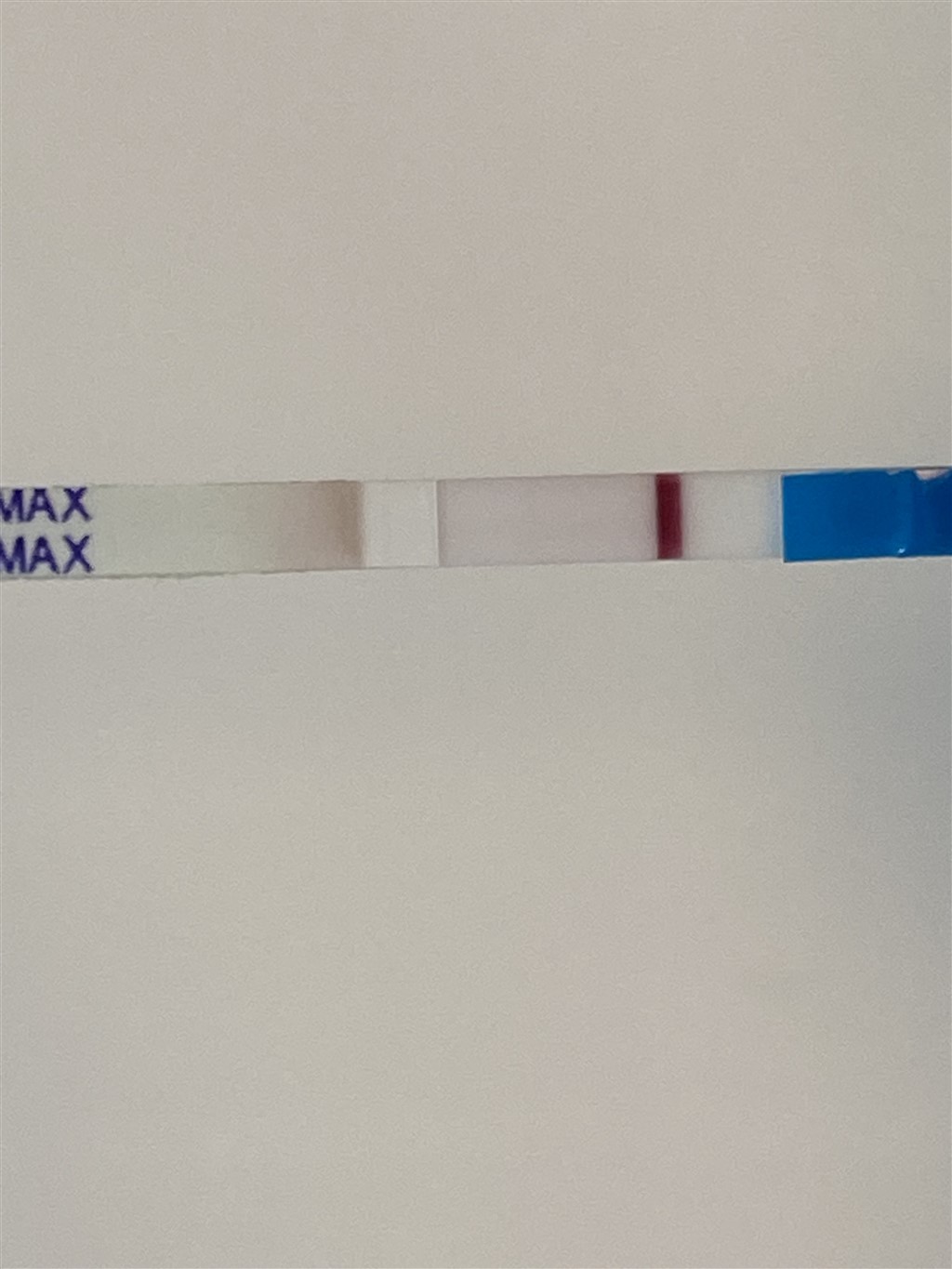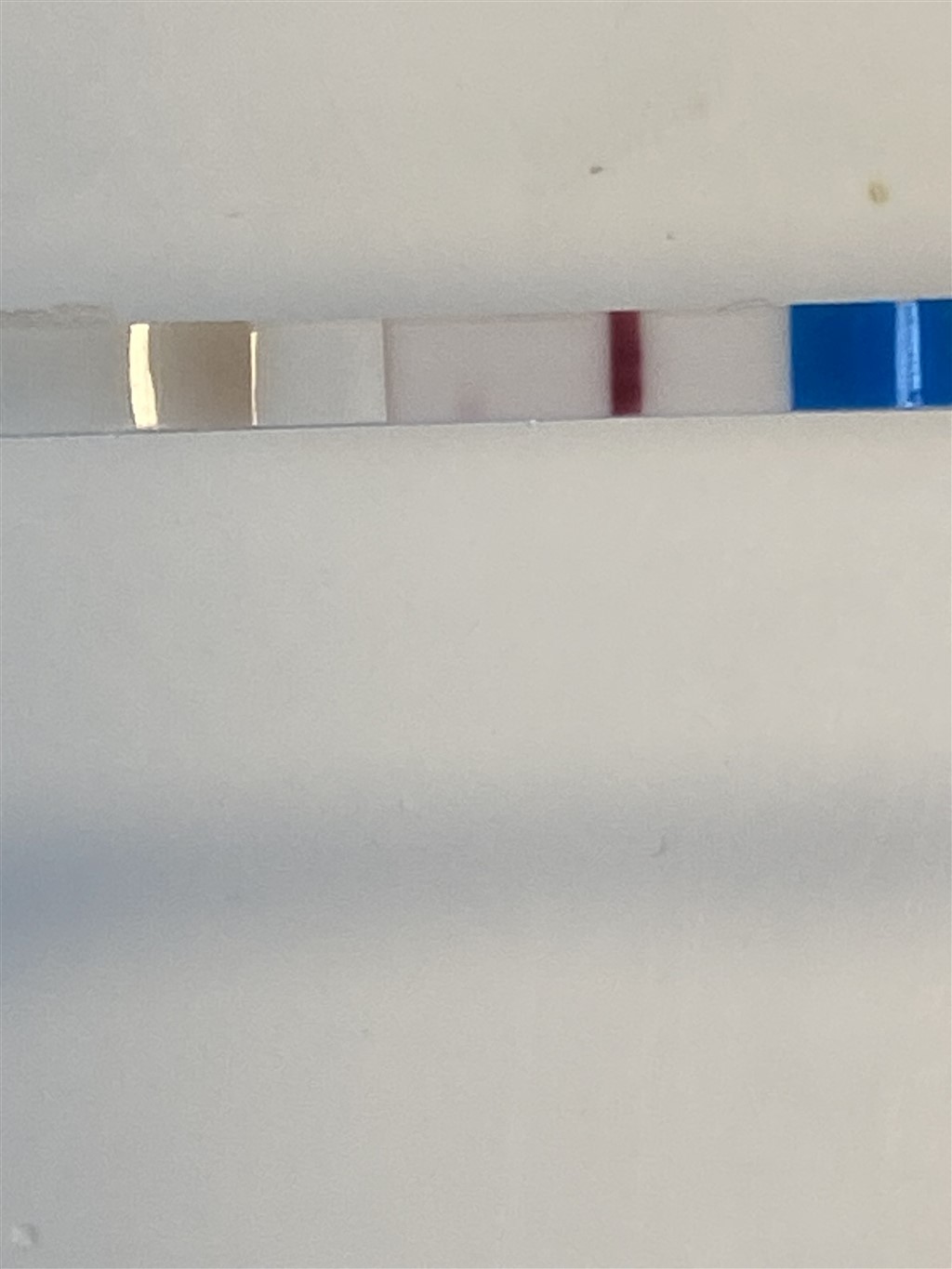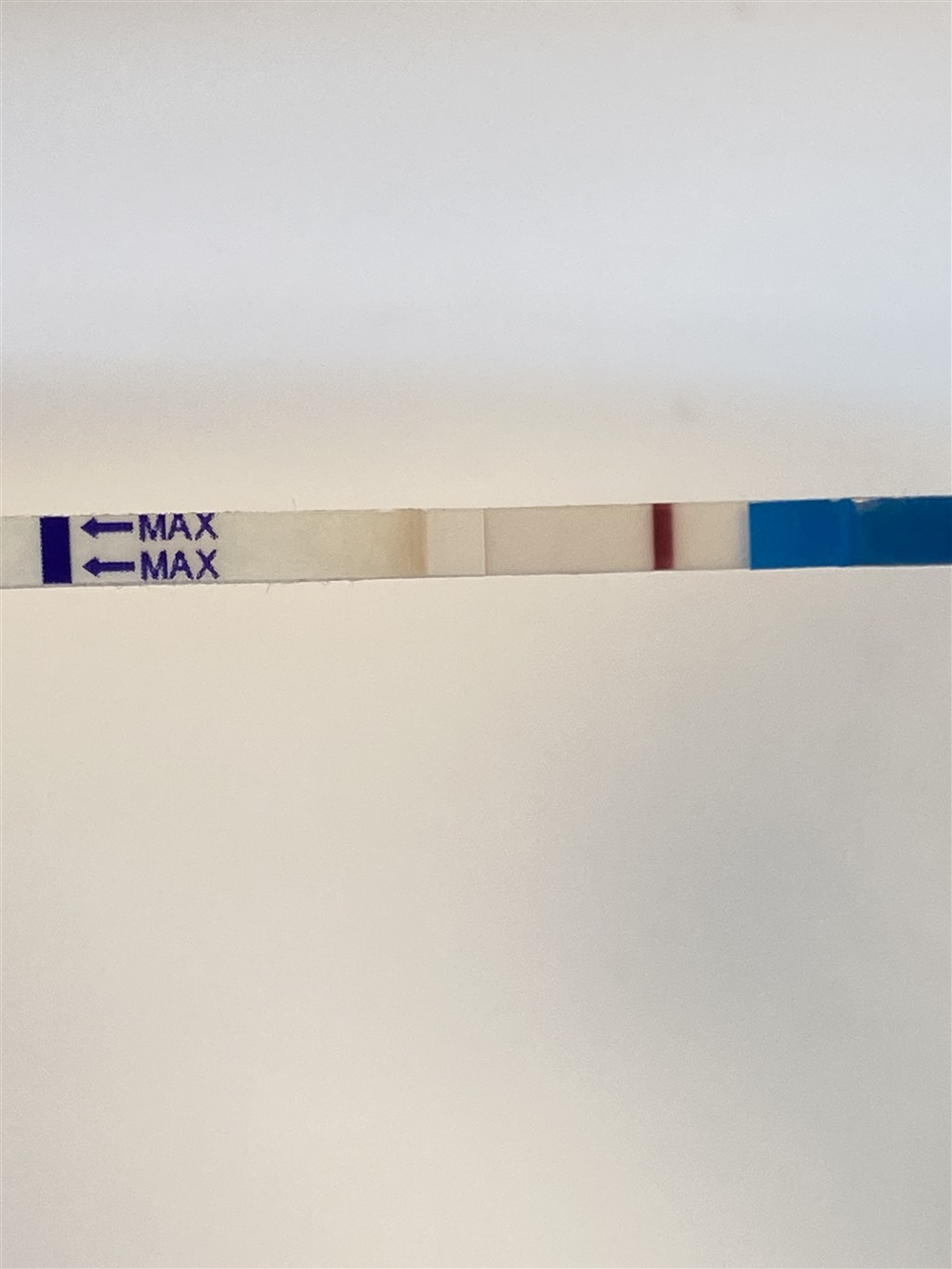 Jeg kan godt ane noget rødt " i bunden" af testen/stregen, men ville ikke stole på den..Stregen skal jo være Helene vejen ned.