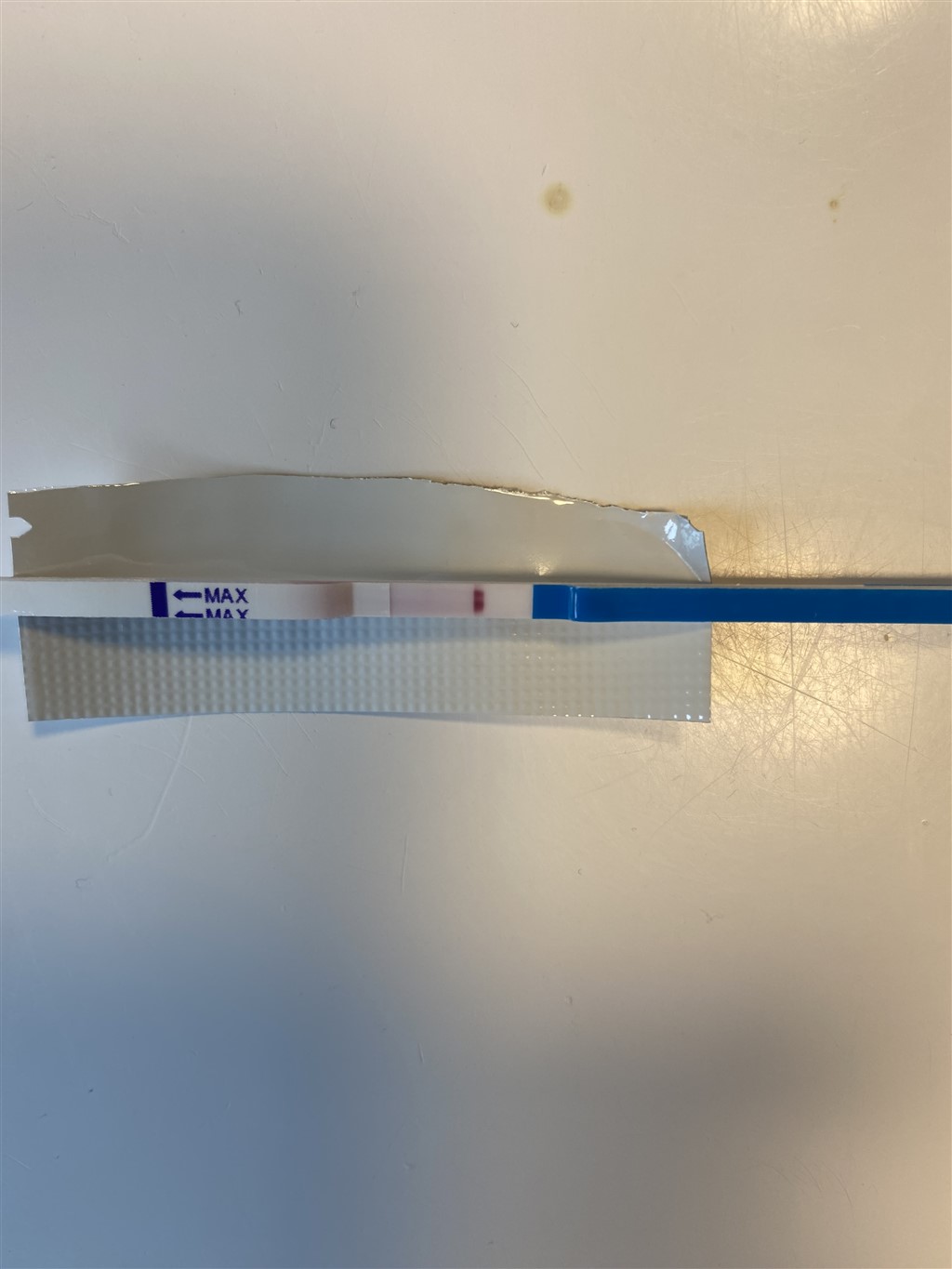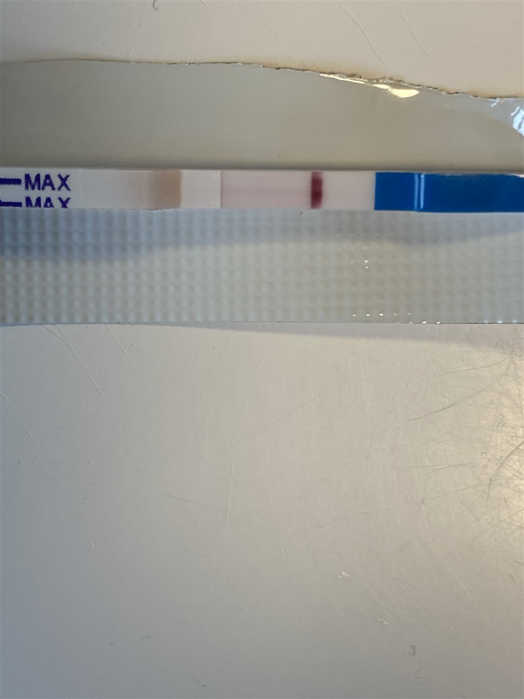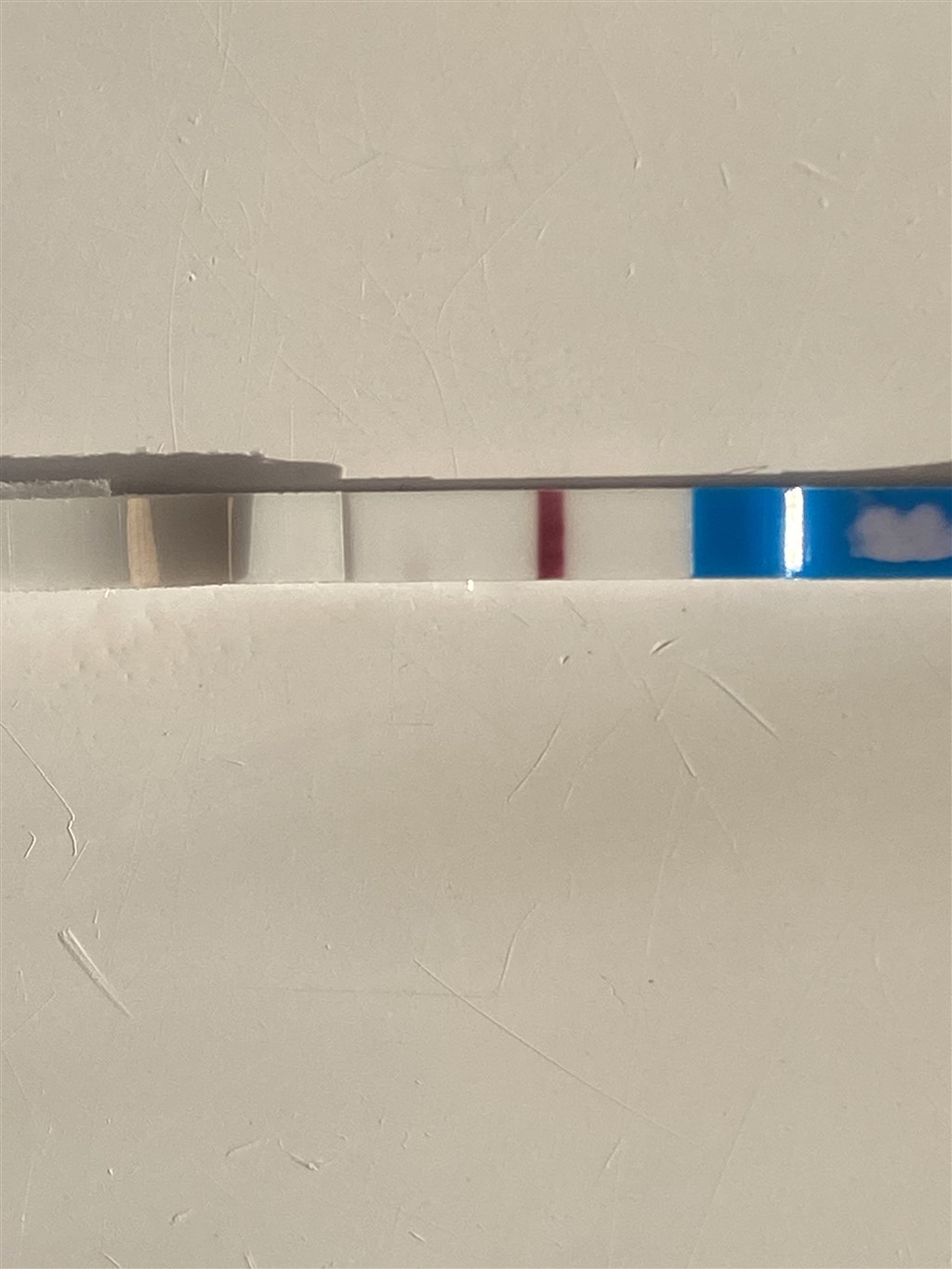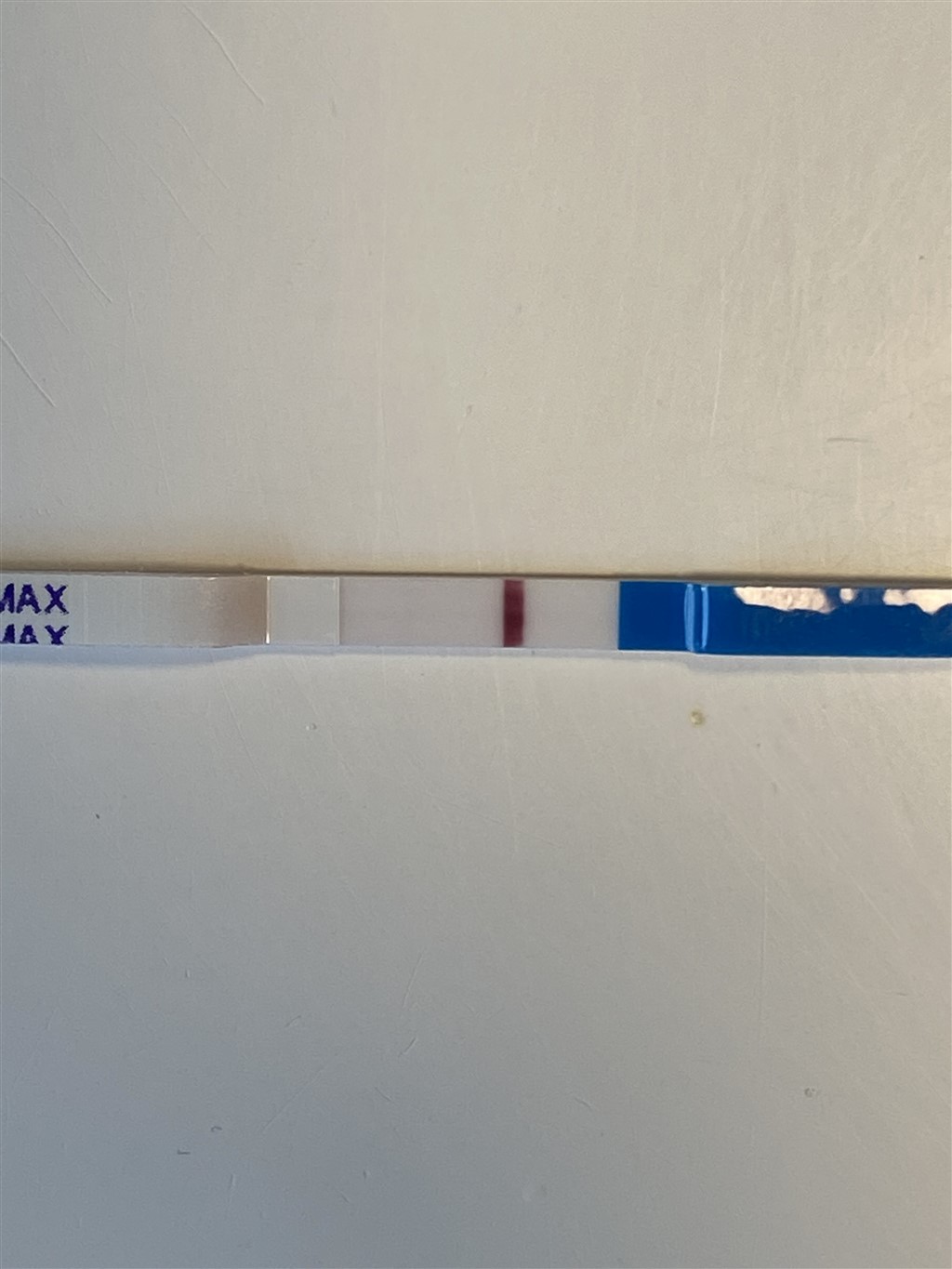 Jeg kan godt ane noget rødt " i bunden" af testen/stregen, men ville ikke stole på den..Stregen skal jo være Helene vejen ned.