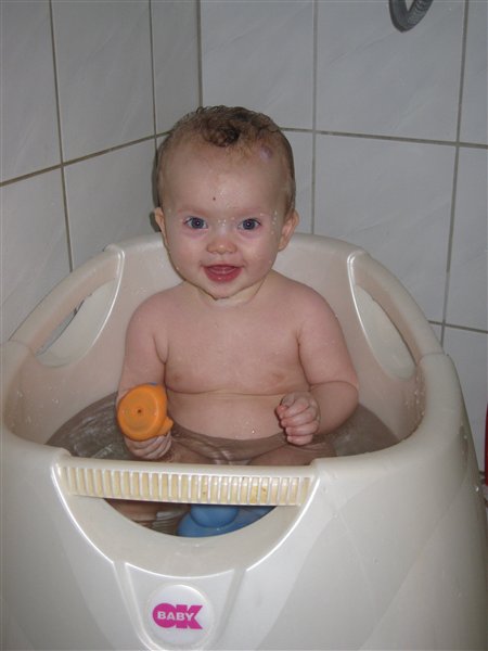 Vi har dette badekar til Luka. Det er en badekar med indbygget sideplads i, hvor de ikke kan vælte, hvis de rejser sig. Det er fantastisk og vi har været så glade for det. De anbefaler, at man først bruger det fra 9 mdr.
