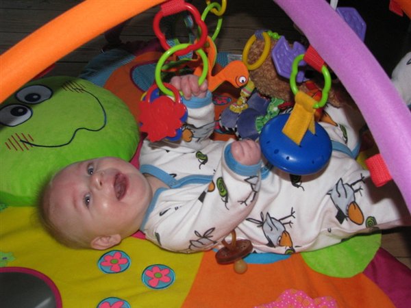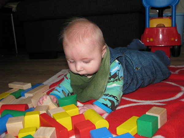 Han gider ikke rulle, men elsker at ligge på maven. Og møver sig efterhånden lidt frem og tilbage og rundt