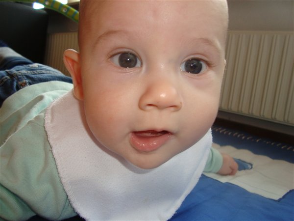 Dog er han ikke så stor, han er nu 60 cm og vejer 5,8 kg. Men trives og er glad. Vi går til kontrol på børne-neurologisk ambulatoium ude på OUH, da de forsøger at finde ud af hvorfor han ikke er så stor (han var 45 cm ved fødslen). Indtil videre er der ingenting galt med ham, så det er jo gode nyheder. Når han fylder 1 år skal vi have hans hjerne scannet, da hans hovedomfang heller ikke er ligeså stort som jævnaldrende. Men vi tager det hele stille og roligt.