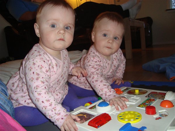 Det er helt vildt at tænke på for 9mdr siden stod vi der med to små piger på lidt over 2000g og 46/47cm lange nu er vejder de omkring de 10kg og er over 75cm lange.... De er blevet et par bestemte damer og er over alt i stuen, de kommer op på alle fire men kravler kun bag ud endnu.... De har lært at sidde selv men falder bag over nogle gange så kan vi høre det i hele huset hvis de ikke lige rammer puden. De elsker at tage hinnanes sutter og legetøj, men nu er de begyndt at skrige hvis den ene stjæler legetøjet fra den anden, så det bliver til noget skrigerri i løbet af dagen. Der er godt nok meget at se til i denne her alder, selvom min mand er hjælpsom når han er hjemme, er det mest med de pratiske ting i huset han hjælper med til, jeg styger mest showet med pigerne.. jeg skal ikke klage for han hjælper,men nogle gange kan det bare godt blive for meget og så har man brug for han tager over... Så den anden dag fik jeg min helt først FRI DAG, uden jeg skulle gøre noget her hjemme eller med pigerne.. og om aften kom han med en stor buket blomster til mig, han lavede også en helt vild god fiskeret til os, vildt hyggeligt...