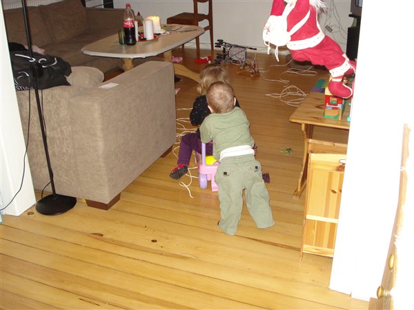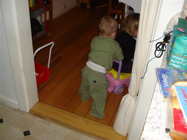 Er det ikke bare godt... Min søn er ved at lære at gå... Vi skal bare lige have organiseret en gå vogn, for den her konstellation er ikke helt holdbar i længden, da Laura ikke lige kan styre hastigheden til at lillebror kan følge med...