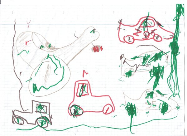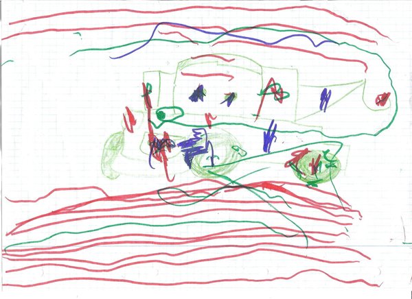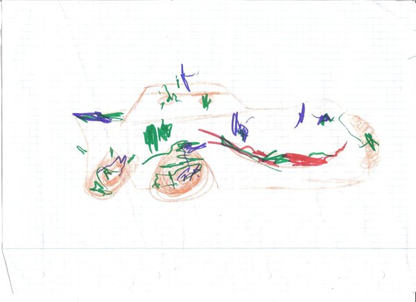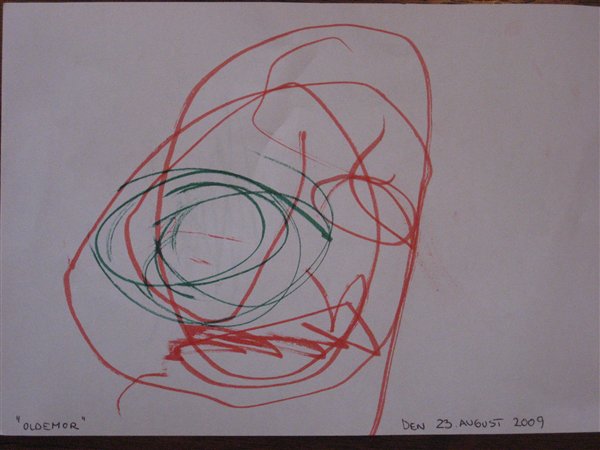 Sofie vil meget gerne have mig til at tegne sommerfugle, og når "grundridset" er tegnet, bestemmer hun, hvilke farver den skal fyldes ud med. Hun tegner stort set hver dag, men det er også hér en omgang kruseduller, der hver repræsenterer hhv. Samson, biler, dukke, mismiau osv.