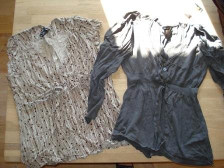 Kortærmede trøje fra H&M brun og hvid str. M, med bindesnor over maven + Grå cardigan fra Mama Licious str. M
