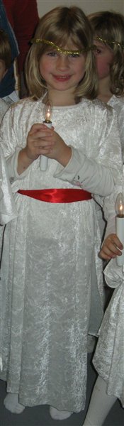 Hvor er hun fin!!!! :-) Filuca og børnehaven gik på det lokale plejehjem, så ligesom for Susan, var der heller ikke noget for forældrene, men jeg spurgte om jeg måtte komme derop, de trak lidt på det... Træls! Men ½ time efter fik jeg en sms fra en af pædagogerne om jeg ville komme derop og hjælpe med at få ungerne i Luciatøjet, så Milas og jeg kørte derop, det var SÅ godt:-)