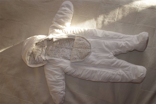10: flyverdragt i neutrale farver med futter og handsker str 68. 80 kr