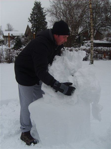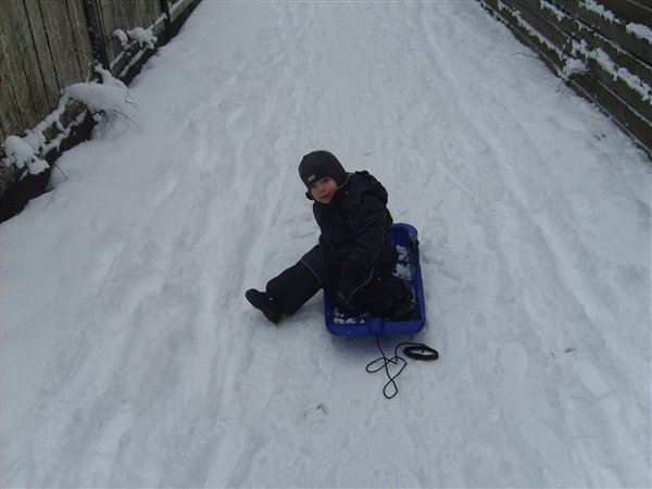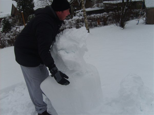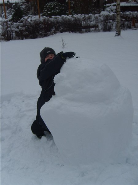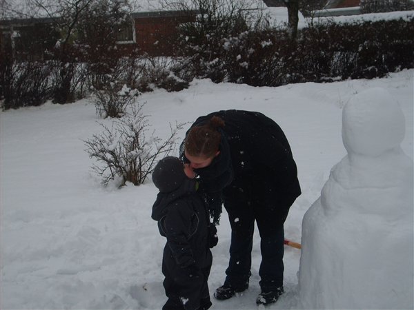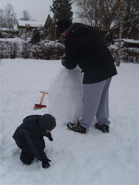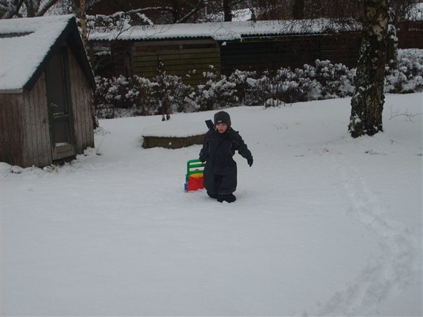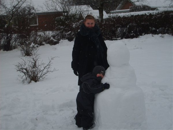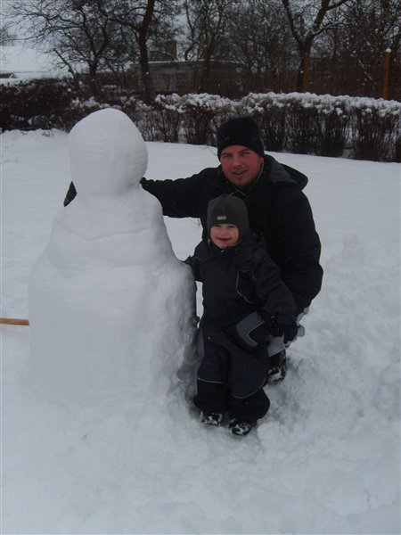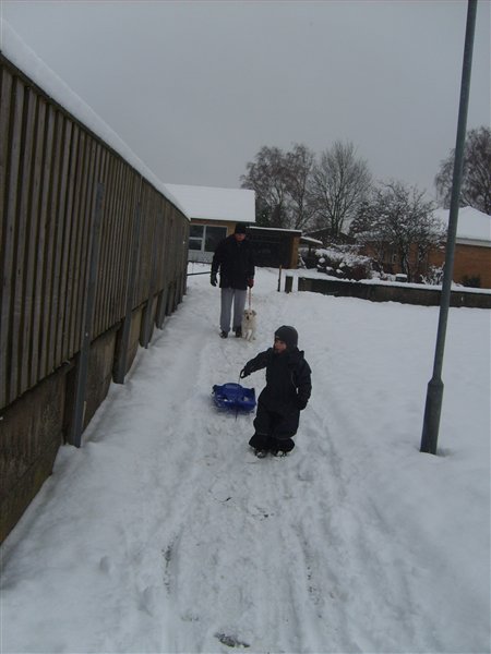 Vi har været ud at kælke (eller rettere trække med kælk) og bygge snemand idag. Dennis var tyve min om at køre 10 km og han har altså 23 km til job. Så han vendte om og holder snefri sammen med Ollie og jeg idag