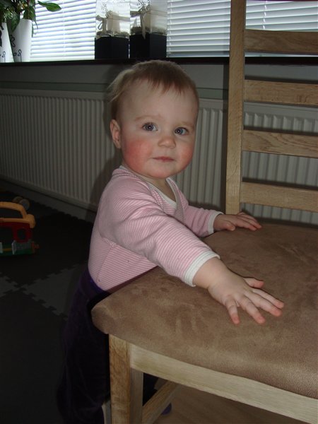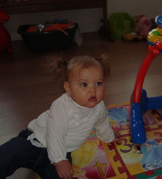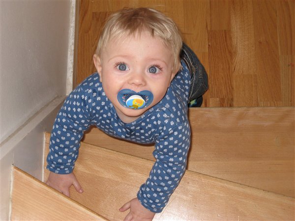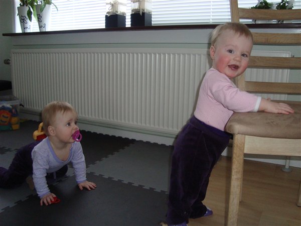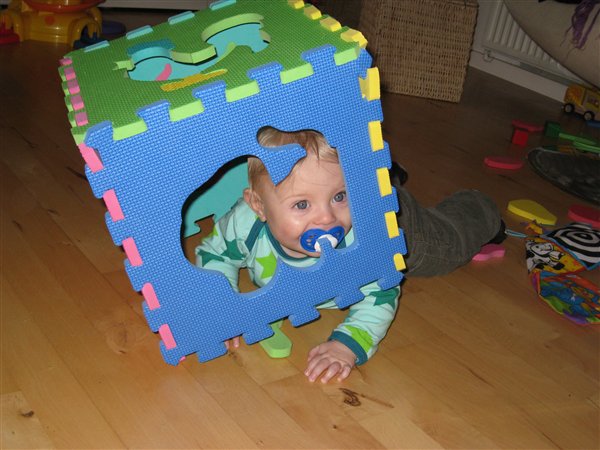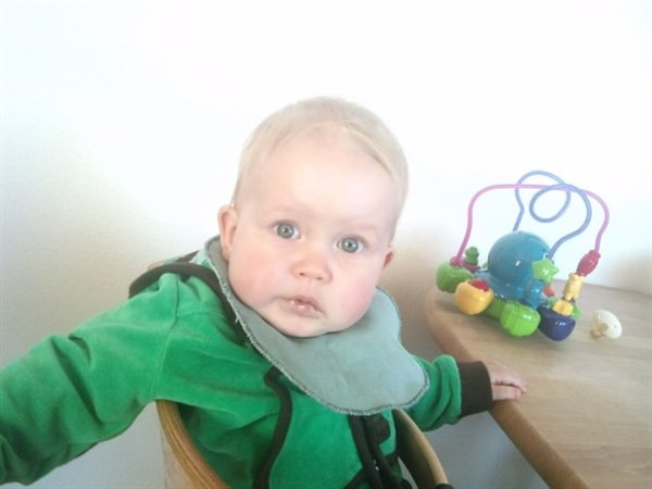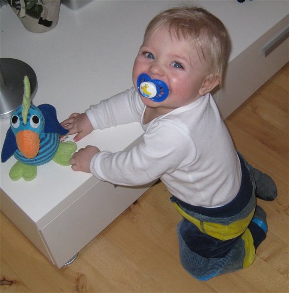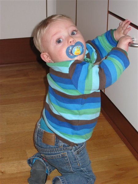 Linus har kravlet siden jul og rejser op af alt ... teknikken og balancen er dog ikke helt i top endnu, så ofte resultere det i en del fald på numsen når han kanter sig rundt om borde, radiatore etc.