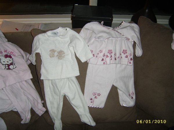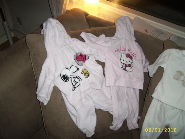 5 langærmede bodystock, 2 par strømpebukser, 1 par smækbukser, 5 kortærmede bodyer, 1 kjole, 1 cardigan, 1 hue, 5 natdragter, 2 sparkedragter uden fødder, 5 med fødder, 1 sæt bukser og bluse med Kitty, 1 sæt bukser og bluse med Nuser, 2 sæt med bukser og bluse uden fødder og 1 med fødder, 1 tynd jakke/trøje, 1 varm dragt/køredragt