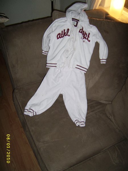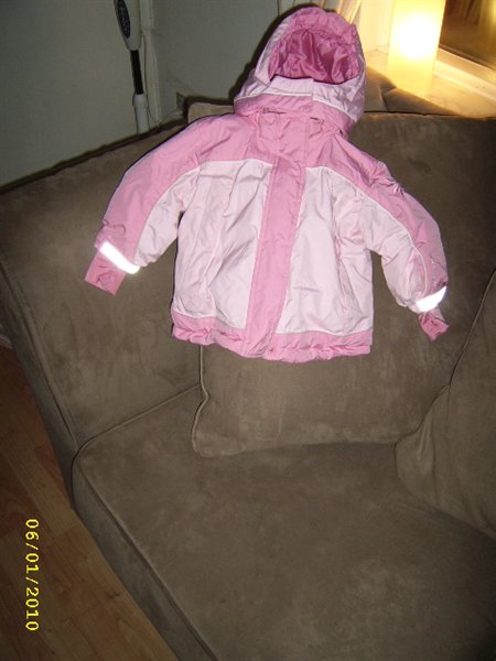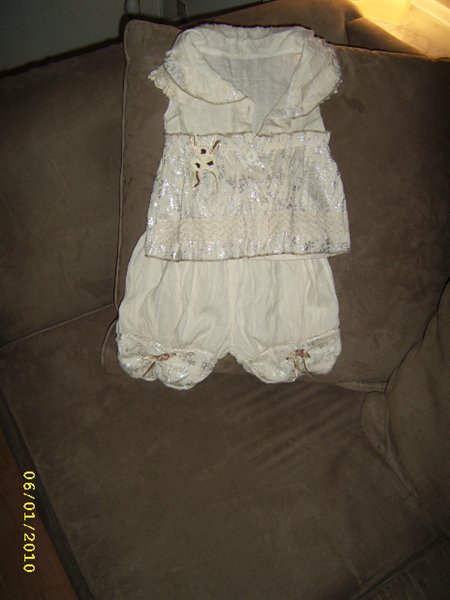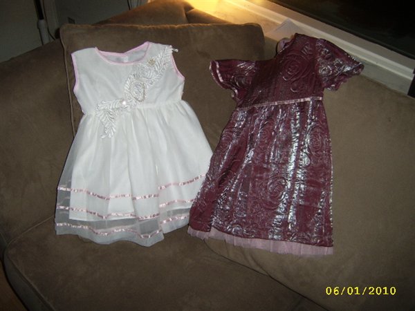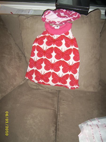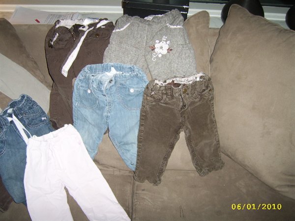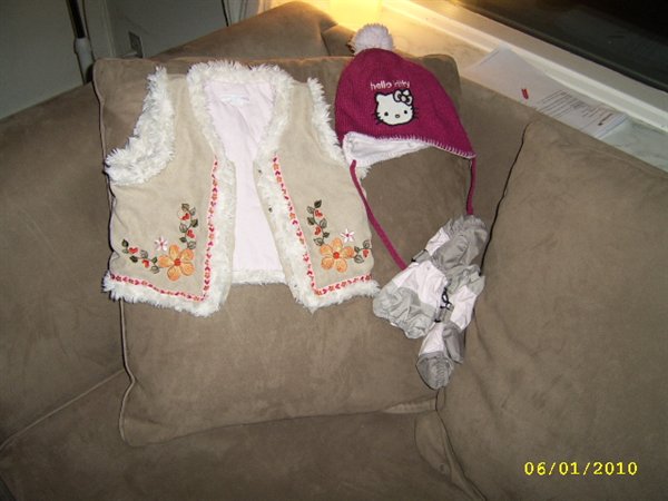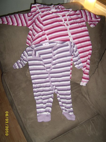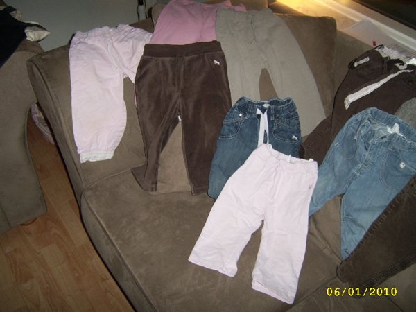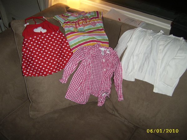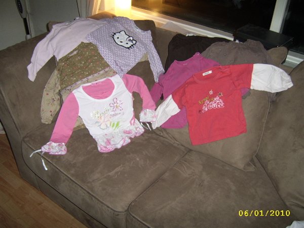 1 flyverdragt, 1 vinter jakke, 4 kjoler, 1 varm fleectrøje, 1 langarmet bodystock, 7 par strømpebukser, 4 kortærmede bodyer, 1 T-shirt, 1 skjorte, 1 badedragt, 1 solhat, 2 cardigan, 2 nederdele, 1 varm vest, 1 hue, 10 par forskellige bukser, 1 par vanter, 1 kortærmet skjorte med et par korte bukser til, 8 langærmede bluser, 3 natdragter, 1 sæt joggintøj