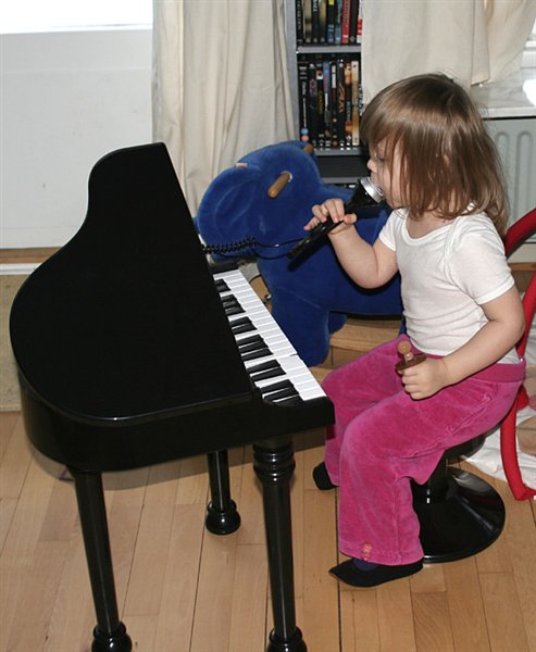Men tilbage til barnet. Første gang vi var der, gik hun direkte hen til hylderne med legetøj - vi var de første, der kom - og begyndte at lege højlydt snakkende og grinende. Da der begyndte at komme børn, kiggede hun interesseret på dem og forsøgte at skabe kontakt ved at vise dem legetøj. Hun blev slet ikke genert eller utryg.