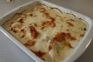 Lig fisken i et smurt ovenfast fad, derefter den kogte spinat, lasangeplader og ostesovs, gentages to gange! slut af med ostesovs! drys derefter ost på toppen (giver en flot brun farve.