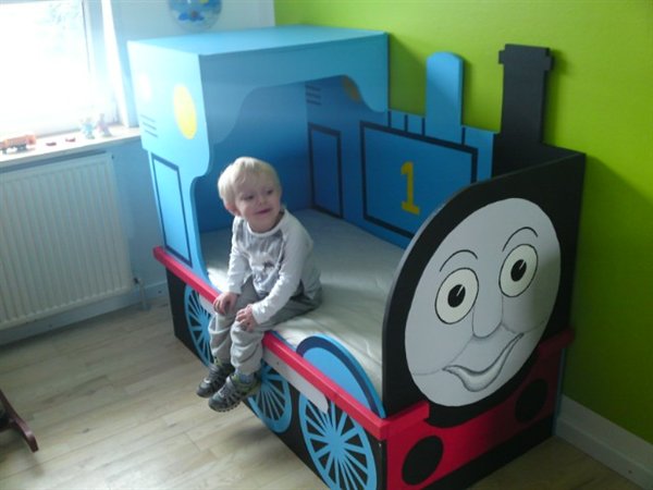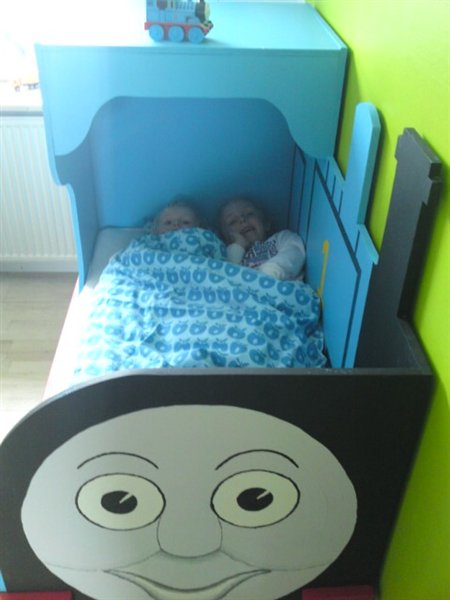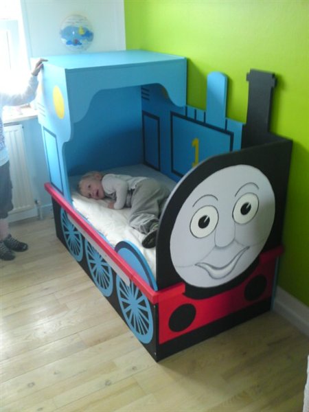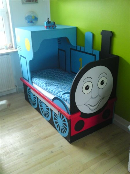 Men han mente altså helt sikkert Milas skulle ha' en seng med Toget Thomas:-) Så han har TAGET sig tid til det, er stået op kl. 7 flere weekender og kørt ind i firmaet og malet på den osv:-)