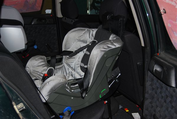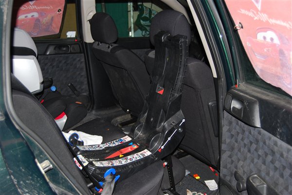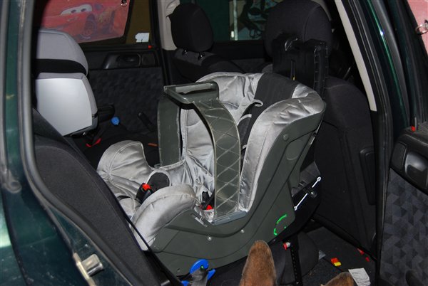 Stolen til den lille...kan i ikke bare flytte den med barnet? Vores isofix-base kommer til at være i Christians bil, så den bare kan klikkes deri, men stolen kan jo også sættes i min bil med tre-punkt-selen. Vi skal sgutte ha to stole bare fordi der er to biler. Vi tager jo stolen med ind fra bilen... gør i ikke det?