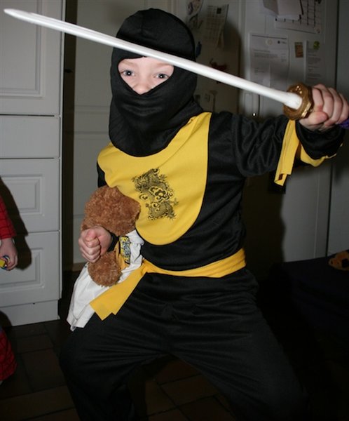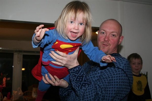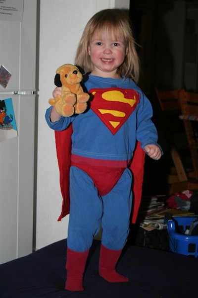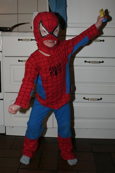 6-10. Fastelavnsbørnene. Moren troede, hun skulle have to prinsesser, men nej, de ville være Spiderman og Superman. Signe har Sebastians gamle Spidermankostume på, mens Nanna har et Supermandsnatsæt påsyet stort logo og kappe, samt storebrors røde underbukser på (jeg følte mig vældig kreativ den aften). Sebastian er Ninja (der har lidt svært med at få luft med hætten på - derfor den lille næsetip).