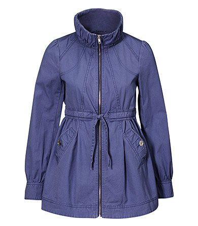 Model med vidde forneden. Lynlås foran og høj kinakrave med rynkeeffekt. Løbegang i taljen og lommer foran med knaplukning.