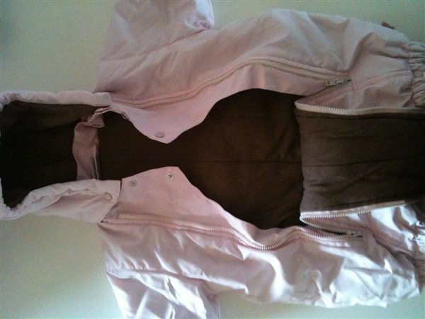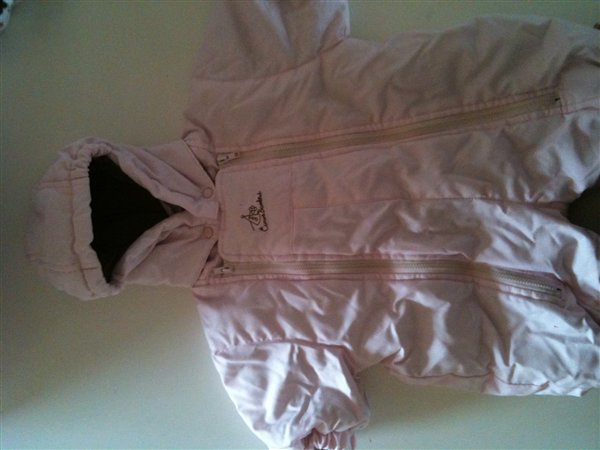 detaljer: huen kan knappes af, der er lynlås ved fødderne og knapper så den kan laves til en "pose", der er bobbelt lynlås foran