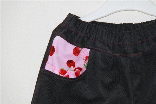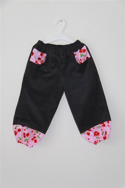 Seje bukser i Stengråt babyfløjl / Kirsebær bomuldsstof syes på bestilling i str. 62-98. Jeg har stof til 2/3 par mere og jeg kan ikke skaffe det igen, så først til mølle.