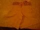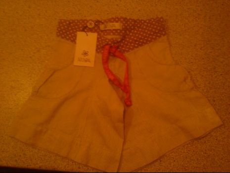 Shortsene er str. 92 og mørkebeigestribet med lysbeige underfarve... Det er nok det man vil kalde en buksenederdel og har lommer i begge sider... Den bindes foran med rød snor... Ekstrem sød og kan bruges med strømpebukser under... Nypris 199 - købt på tilbud til 139,- Sælges for 50 + porto