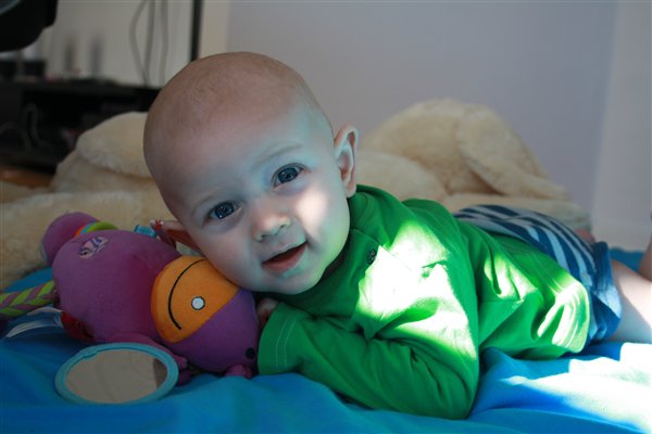 Det går ellers rigtig stærkt og han har kunnet sidde selv i en måneds tid nu, så nu må vi se hvor længe der går før han kan kravle.