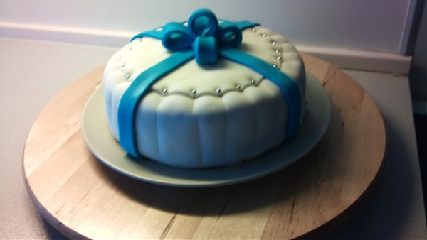Puhh synes sgu det var svære end jeg lige troede, først gik kom der et stort hul i siden, derfor det knap så pæne skilt, og så hul i toppen hehe... men her er første forsøg lige på en MMF dåbskage... :-D