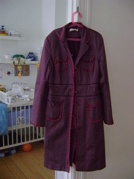 Frakken er brugt få gange og er bordeaux. Ny pris var kr. 1500.