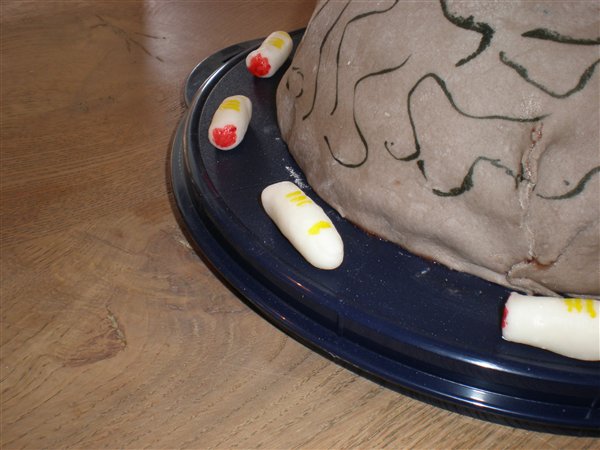 Almindelige lagkagebunde med tobleronecreme og jordbærcreme. Den er smurt med jordbærsyltetøj for at få lidt blod-effekt. Det var så ikke meningen den skulle revne, men effekten er jo meget god..