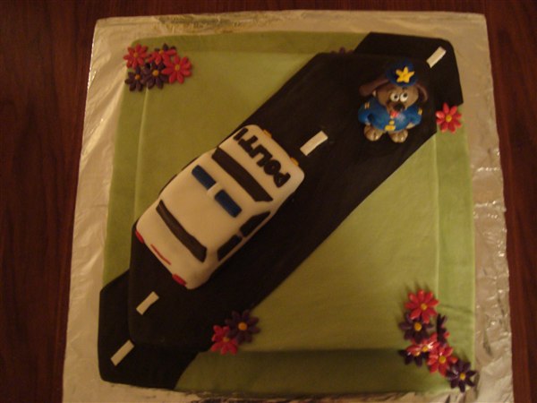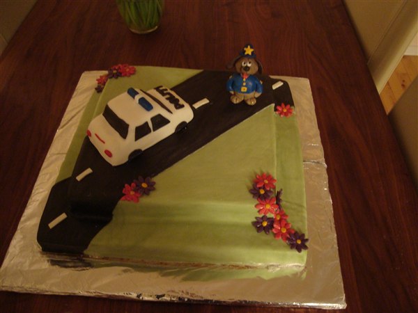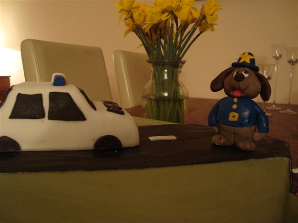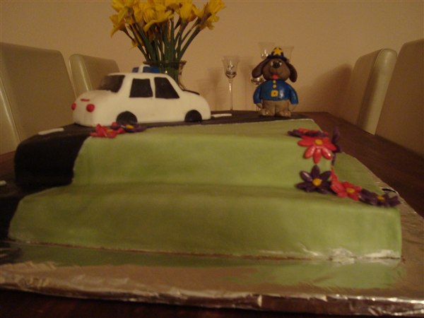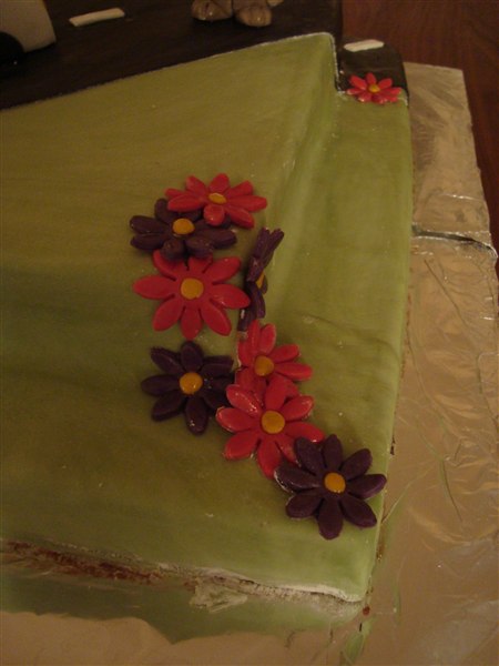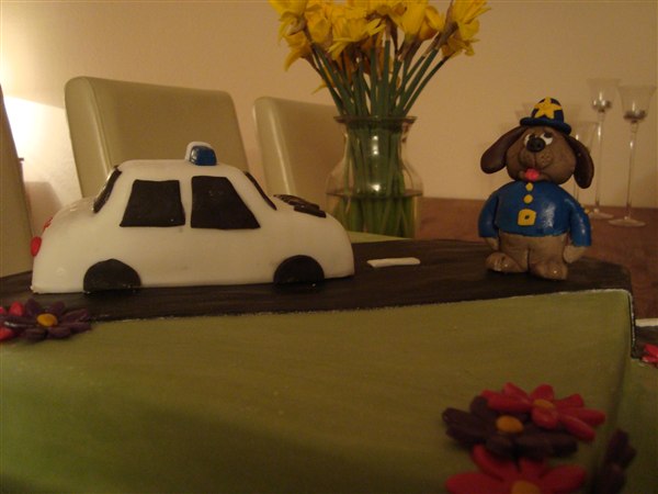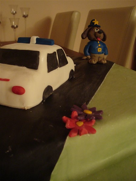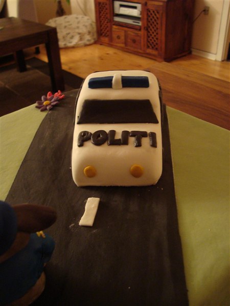 Klokken er nu 00.05 og jeg sidder og er godt smadret... Det var jo sådan at svigermor skulle have en kage på tirsdag, hvor hun stopper på hendes arbejde på politigården... Så ringer hun tirsdag eftermiddag og spørger om den kan blive til imorgen (torsdag) i stedet... ÅH ÅH... Øhh... Jo... Så mig ud og handle ind til mudcake... For det var jo den jeg havde bestemt mig for at lave... Og den skal jo helst stå et par dage... Fik så lavet kagerne igår aftes, så der kom jeg først i seng kl halv et... Op i morgen og lave fyld, få kagerne flækket og fyldt... Og lavet MMF... Og så på arbejde kl 10.45... Her i aften har jeg så fået pyntet den... Er sørme ikke nemt med sådan en stor kage... Og køkkenet lignede mildt sagt et bombekrater, som jeg selvfølgelig ikke fik taget billeder af... Men nu er der igen normaltilstand derude og her er resultatet af en lidt stressende kage... Kan se at jeg ikke har fået tørret alt maizenaen af, men det bliver i morgen, for vil ikke tvære i den nu...