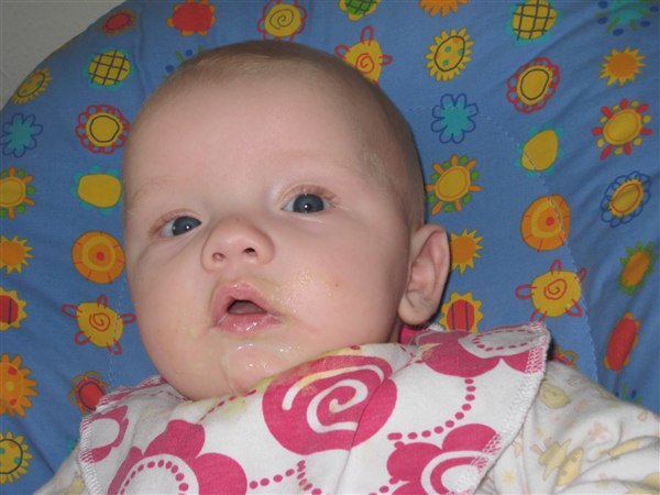 så blev vores dejlgie lille malou endelige 4 måneder og vi er gået over til hjemmelavet kartoffelmos med grøntsager, og det glider godt ned, meeen skal dog lige lære og spise af ske. men hun er rigtig dygtig. er så stolt af min dejlige lille pige..