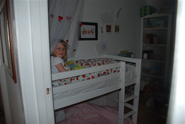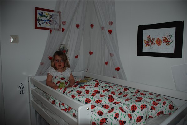 jo hun er pavestolt, og søster er misundelig. Nu mangler vi bare at gøre det lidt hyggeligt under sengen også - men ting tager tid! Alma får også såden en seng på et tidspunkt, vi skal bare lige spare 2600 norske bananer sammen!
