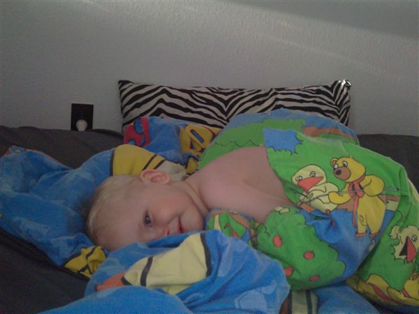 Århh hvor er han fin!! Og han ser ud til at være liuge så tosset med sin dyne som Maya er