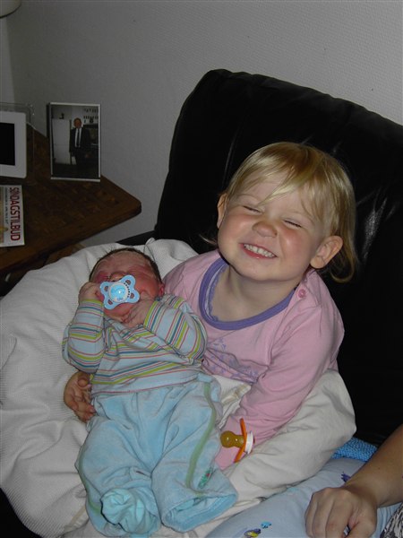 Nu er han allerede en hel uge (om præcis 3 timer i skrivende stund), og han er bare dejlig. Han spiser noget oftere end sin søster = mindre nattesøvn, men han er nem, mild og glad, når han er vågen. Caroline har taget så fint imod ham, og selvom hun (selvfølgelig) har fået skoldkopper i går, går hun meget op i lillebrors ve og vel. Så indtil videre lever vi i ren babylykke.