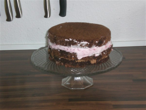 Det er hjemmebagte chokolade lagkagebunde, med daimcrem og hindbærmousse.