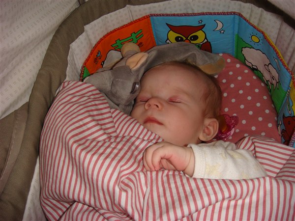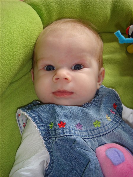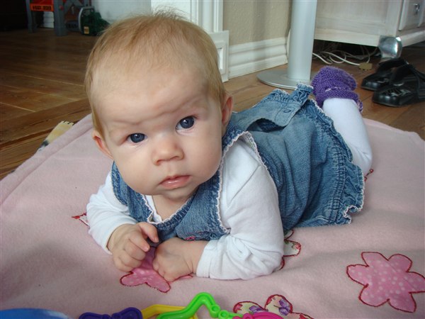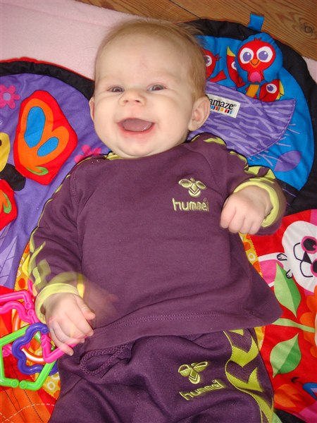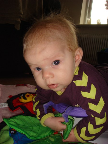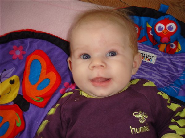 Clara er en super skøn pige! Hun pludrer og smiler sig gennem dagen! Hun sover fantastisk godt, både dag og nat og putter sig selv i barnevognen.. Vi har også fået styr på putningen om aftenen, så hun enten falder i søvn i hendes hængevugge eller i liften og det går bare rigtig godt. Hun græder kun hvis hun er træt eller hvis mor her er for længe om at pakke pattern ud når det er spisetid