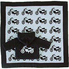"Så fås det ikke federe! Tæppet er importeret fra USA hvor det er hotteste trend. Kundelisten tæller diverse celebs heriblandt Angelina Jolie Julia Roberts og Jennifer Garner. Tæppet er i 80 % bomuld og 20 % cashmir og den første rigtige luksus til guldklumpen. Det er super blødt og perfekt til at svøbe den lille i eller lade det større barn have over sig i klapvognen. Designet med motorcykler er råt og frækt og tæppet kan vendes så farverne vises modsat. Tæppet kan maskinvaskes. Størrelsen er 82 x 82 cm."