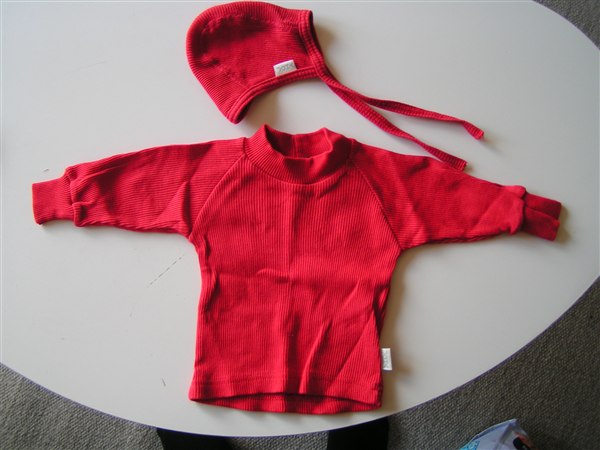 1) rød bluse og hue fra JOHA, str. 50, aldrig brugt, kun vasket.20kr