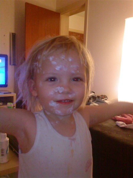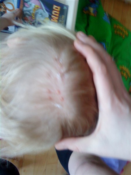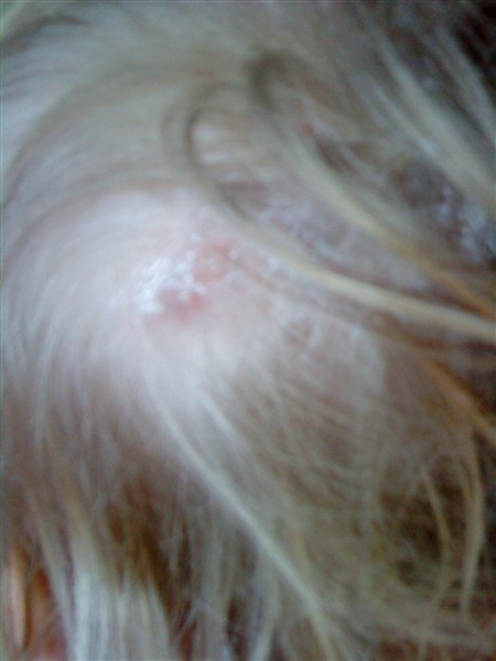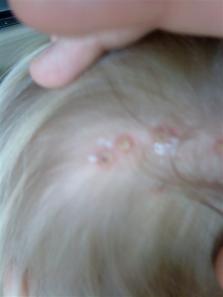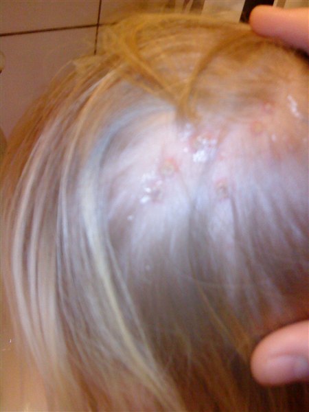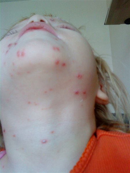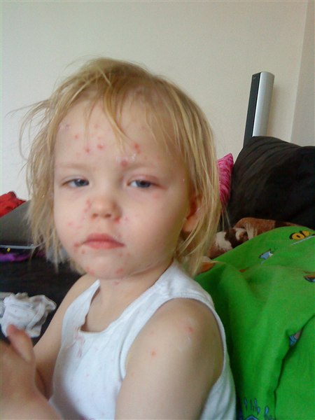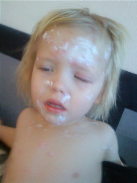 Jeg fik cytelium lotion (zinkspray) og Xylocain gel som er lokalt bedøvende.. Begge kan købes i håndkøb.. Og det hjælper! Jeg var ovre min omgang i løbet af 1½ uge, og min datter (Som var meget hårdt ramt - se billederne) var næsten 2 uger og hun kløede ikke eftersom hun nød den kølende fornemmelse gelén giver.. Der er kun et af mig, jeg var mest ramt på ryggen... Men hun havde masser bl.a. i munden.........