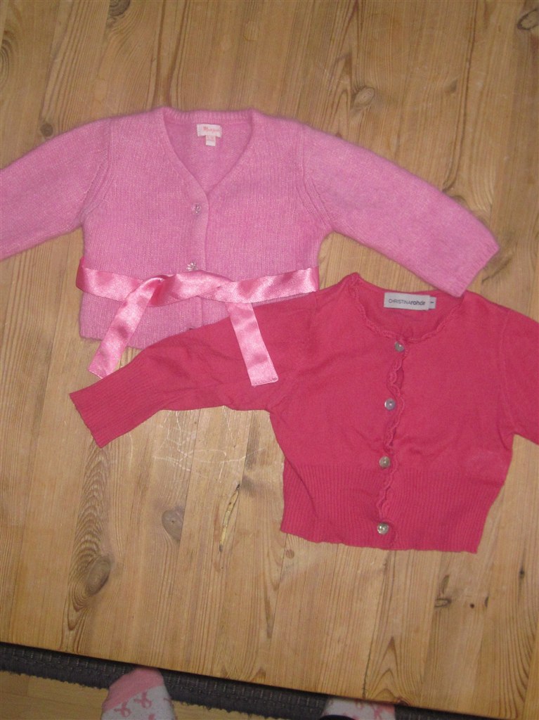 23. lyserød angora cardigan fra monsoon str. 6-12 mdr og pink bomuldscardigan fra rohde str. 1 år. begge gode , men brugte.