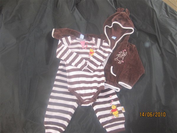 billede2: bukser, body og trøje veluor disney (peter plys) str 80,aldrig brugt kun vasket en gang 80kr